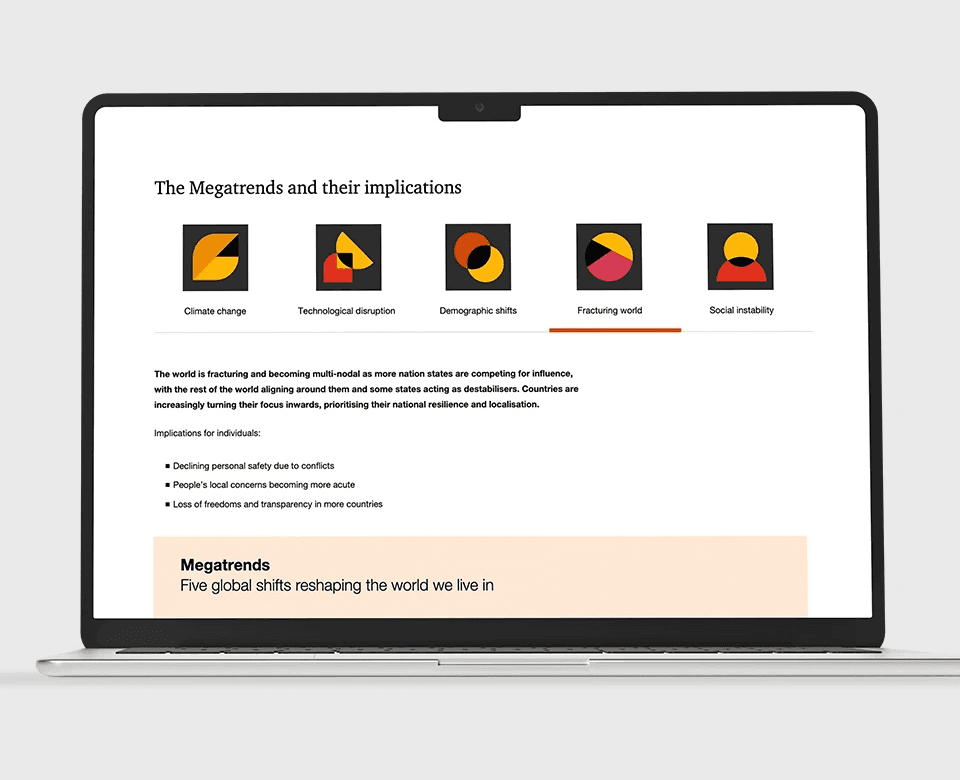 I led the conceptual exploration and design development, creating five distinct icons leveraging PwC’s geometric design language and brand color system. Each icon was crafted to communicate the essence of its respective Megatrend while functioning as part of a cohesive visual family.